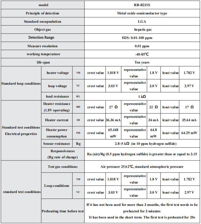This sensor can be embedded in a variety of instruments or environmental improvement equipment related to the concentration of hydrogen sulfide in the air, providing timely and accurate concentration data for them. The detection process is convenient, accurate measurement, reliable operation, no need for re-calibration, greatly reducing the research and development cost, production cost.Feature: high sensitivity high resolution Small size, low power consumption Long service lifeApplication Indoor air quality monitoring Sewage treatment natural gas detection Industrial safety monitoring mine safety2. Basic test circuit:The MEMS micro-thermal plate requires the application of two voltages: the heater voltage VH and the loop voltage VC.When a voltage is applied to the built-in heater, the sensing layer material is heated to the optimal temperature required for detecting the target gas. The loop voltage is applied to measure the voltage VRL across the load resistor RL connected in series with the sensor. A DC power supply is used, and it is important to distinguish the polarity of the sensor. As long as the electrical characteristics of the sensor are met, the loop voltage VC and the heater voltage VH can share the same power supply circuit. To optimize the alarm level and ensure that themaximum power consumption of the sensitive material layer remains below its limit, the resistance value of the load resistor RL must be selected.